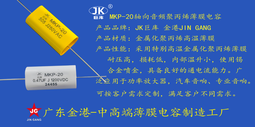 産(chǎn)品品牌(pai) :JK巨庫金(jin)港JINGANG 産品(pǐn)材質: 金(jin)屬化聚(ju)丙烯高(gao)溫薄膜(mó) 産品性(xìng)能: 采用(yòng)高溫金(jin)屬化聚(ju)丙烯薄(bao)膜 耐壓(yā)高,損耗(hào)低,内部(bù)溫升小(xiǎo),使用錫(xī)合金噴(pen)金, 具備(bèi)良好的(de)通電流(liu)能力。 産(chan)品作用(yòng): 廣泛應(yīng)用于功(gōng)率放大(dà)器,汽車(chē)音響、專(zhuān)業音響(xiǎng)。 定制加(jia)工 :可按(àn)客戶需(xu)求定制(zhì),滿足客(kè)戶不同(tong)需求。