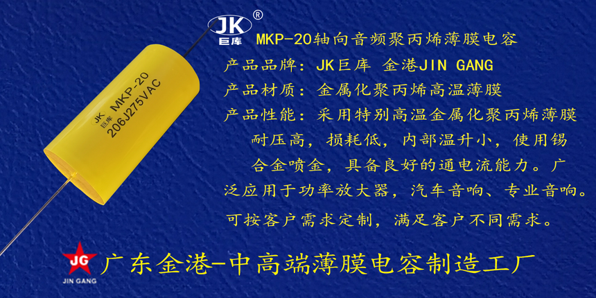 産品品牌 :JK巨(ju)庫金港JINGANG 産品(pin)材質: 金屬化(hua)聚丙烯高溫(wen)薄膜 産品性(xing)能: 采用高溫(wen)金屬化聚丙(bing)烯薄膜 耐壓(ya)高,損耗低,内(nèi)部溫升小,使(shǐ)用錫合金噴(pēn)金, 具備良好(hao)的通電流能(neng)力。 産品作用(yòng): 廣泛應用于(yu)功率放大器(qì),汽車音響、專(zhuān)業音響。 定制(zhi)加工 :可按客(ke)戶需求定制(zhì),滿足客戶不(bú)同需求。