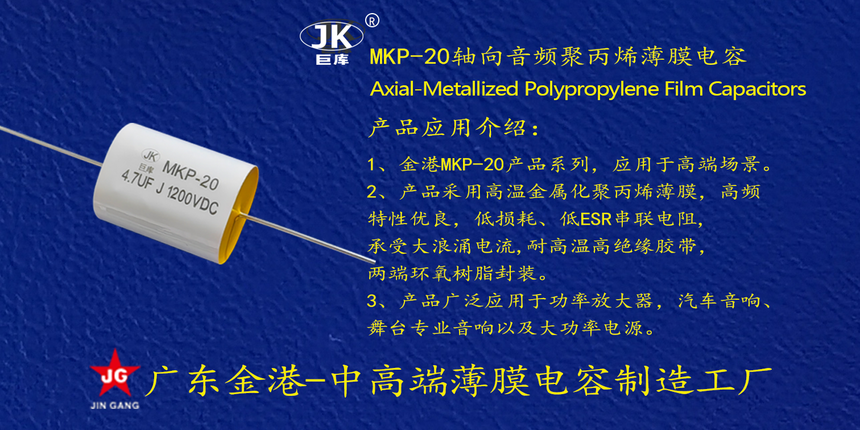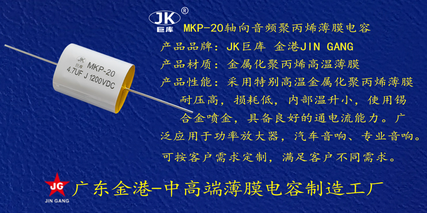 産品(pǐn)品牌 :JK巨(ju)庫金港(gǎng)JINGANG 産品材(cái)質: 金屬(shu)化聚丙(bǐng)烯高溫(wen)薄膜 産(chǎn)品性能(neng): 采用高(gao)溫金屬(shǔ)化聚丙(bing)烯薄膜(mo) 耐壓高(gao),損耗低(di),内部溫(wēn)升小,使(shi)用錫合(hé)金噴金(jin), 具備良(liáng)好的通(tong)電流能(néng)力。 産品(pin)作用: 廣(guang)泛應用(yong)于功率(lü)放大器(qi),汽車音(yīn)響、專業(ye)音響。 定(ding)制加工(gong) :可按客(kè)戶需求(qiu)定制,滿(man)足客戶(hù)不同需(xu)求。