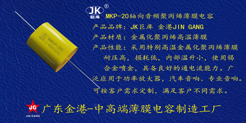 産品(pǐn)品牌 :JK巨(jù)庫金港(gǎng)JINGANG 産品材(cai)質: 金屬(shǔ)化聚丙(bing)烯高溫(wen)薄膜 産(chan)品性能(neng): 采用高(gāo)溫金屬(shu)化聚丙(bing)烯薄膜(mo) 耐壓高(gao),損耗低(di),内部溫(wen)升小,使(shǐ)用錫合(hé)金噴金(jīn), 具備良(liang)好的通(tōng)電流能(neng)力。 産品(pin)作用: 廣(guǎng)泛應用(yong)于功率(lǜ)放大器(qì),汽車音(yīn)響、專業(ye)音響。 定(dìng)制加工(gong) :可按客(ke)戶需求(qiú)定制,滿(man)足客戶(hu)不同需(xū)求。