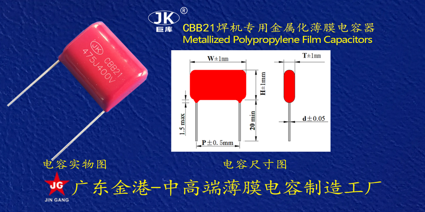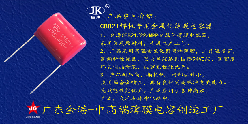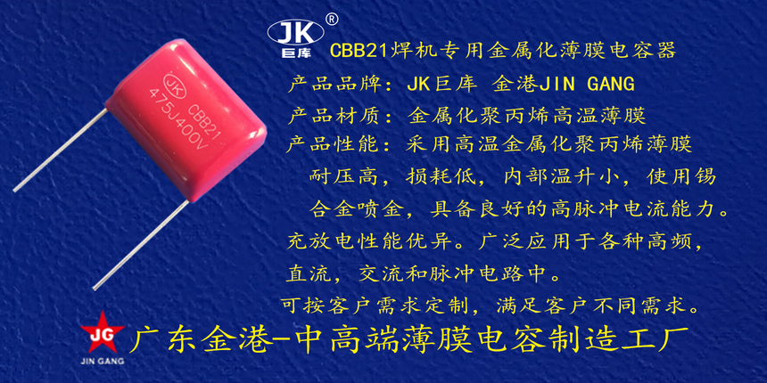 産品品牌(pái) :JK巨庫金港JINGANG 産品材(cái)質: 金屬化聚丙烯(xi)高溫薄膜 産品性(xìng)能: 采用高溫金屬(shǔ)化聚丙烯薄膜 耐(nài)壓高,損耗低,内部(bu)溫升小,使用錫合(he)金噴金, 具備良好(hǎo)的高脈沖電流能(neng)力。 産品作用: 廣泛(fan)應用于各種交流(liú)跨接,抗幹擾電路(lù)場景。 定制加工 :可(kě)按客戶需求定制(zhì),滿足客戶不同需(xu)求。