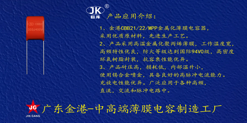 産品品(pin)牌 :JK巨庫金港JINGANG 産品(pin)材質: 金屬化聚丙(bǐng)烯高溫薄膜 産品(pǐn)性能: 采用高溫金(jīn)屬化聚丙烯薄膜(mo) 耐壓高,損耗低,内(nèi)部溫升小,使用錫(xi)合金噴金, 具備良(liáng)好的高脈沖電流(liú)能力充放電性能(néng)優異。 産品作用: 廣(guang)泛應用于各種高(gāo)頻,直流,交流和脈(mò)沖電路中。 定制加(jiā)工 :可按客戶需求(qiu)定制,滿足客戶不(bu)同需求。