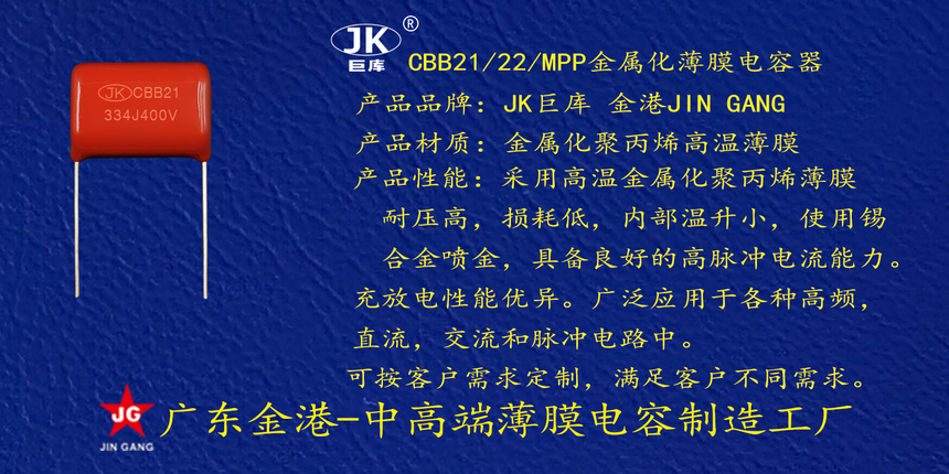 産(chǎn)品品牌(pái) :JK巨庫金(jin)港JINGANG 産品(pin)材質: 金(jin)屬化聚(jù)丙烯高(gao)溫薄膜(mo) 産品性(xing)能: 采用(yong)高溫金(jin)屬化聚(jù)丙烯薄(bao)膜 耐壓(yā)高,損耗(hào)低,内部(bù)溫升小(xiao),使用錫(xī)合金噴(pen)金, 具備(bèi)良好的(de)高脈沖(chòng)電流能(neng)力充放(fàng)電性能(neng)優異。 産(chǎn)品作用(yòng): 廣泛應(yīng)用于各(gè)種高頻(pín),直流,交(jiāo)流和脈(mo)沖電路(lù)中。 定制(zhi)加工 :可(ke)按客戶(hu)需求定(ding)制,滿足(zú)客戶不(bú)同需求(qiú)。