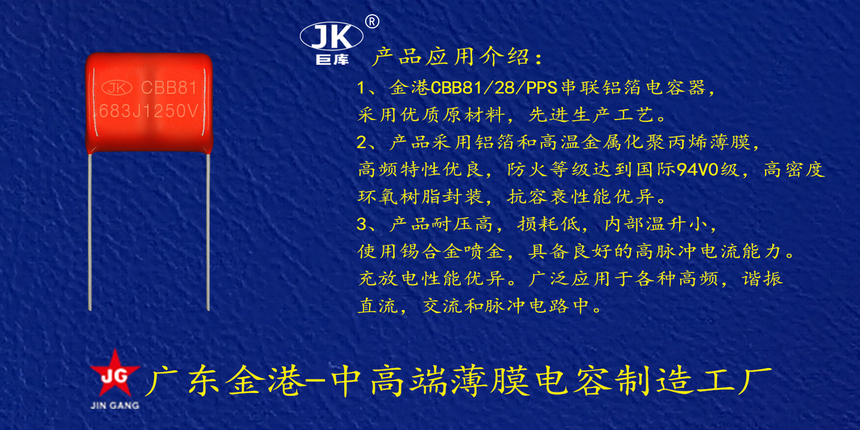 産(chǎn)品品牌 :JK巨庫(ku)金港JINGANG 産品材(cái)質: 金屬化聚(ju)丙烯高溫薄(bao)膜 産品性能(néng): 采用高溫金(jin)屬化聚丙烯(xi)薄膜 耐壓高(gao),損耗低,内部(bu)溫升小,使用(yong)錫合金噴金(jin), 具備良好的(de)高脈沖電流(liu)能力,充放電(diàn)性能優異。 産(chǎn)品作用: 廣泛(fan)應用于各種(zhǒng)高頻諧振,直(zhi)流,交流和脈(mò)沖電路中🌐。 定(ding)制加工 :可按(an)客戶需求定(ding)制,滿足客戶(hu)不同需求。
