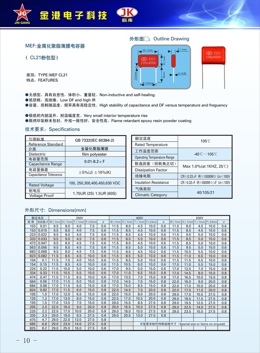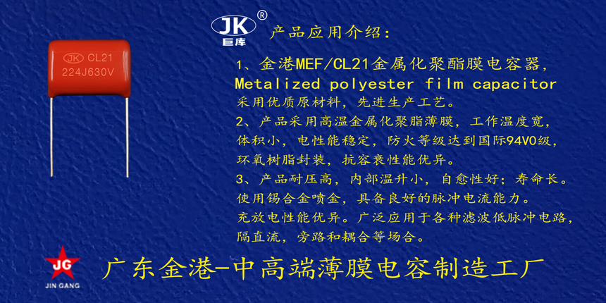 産品(pǐn)品牌 :JK巨(jù)庫金港(gǎng)JINGANG 産品材(cai)質: 金屬(shǔ)化聚丙(bǐng)烯高溫(wen)薄膜 産(chan)品性能(neng): 采用高(gao)溫金屬(shǔ)化聚丙(bǐng)烯薄膜(mo) 耐壓高(gāo),損耗低(dī),内部溫(wen)升小,使(shi)用錫合(hé)金噴金(jin), 具備良(liáng)好的高(gao)脈沖電(diàn)流能力(lì),充放電(diàn)性能優(yōu)異。 産品(pǐn)作用: 廣(guang)泛應用(yong)于各種(zhong)隔直流(liú)濾波,低(dī)脈沖電(diàn)路,旁路(lu)和耦合(hé)等場合(hé)。 定制加(jiā)工 :可按(an)客戶需(xu)求定制(zhì),滿足客(ke)戶不同(tóng)需求。