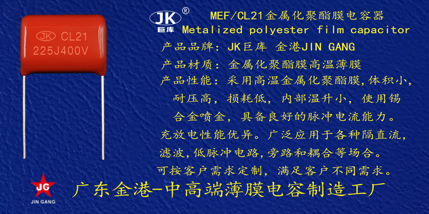 産品品牌 :JK巨(ju)庫金港JINGANG 産品材(cai)質: 金屬化聚丙(bǐng)烯高溫薄膜 産(chan)品性能: 采用高(gao)溫金屬化聚丙(bǐng)烯薄膜 耐壓高(gāo),損耗低,内部溫(wēn)升小,使用錫合(hé)金噴金, 具備良(liáng)好的高脈沖電(dian)流能力,充放電(diàn)性能優異。 産品(pǐn)作用: 廣泛應用(yong)于各種隔直流(liú)濾波,低脈沖電(diàn)路,旁路和耦合(he)🔴等🌈場合。 定制加(jia)工 :可按客戶需(xū)求定制,滿足客(kè)戶不同需求。