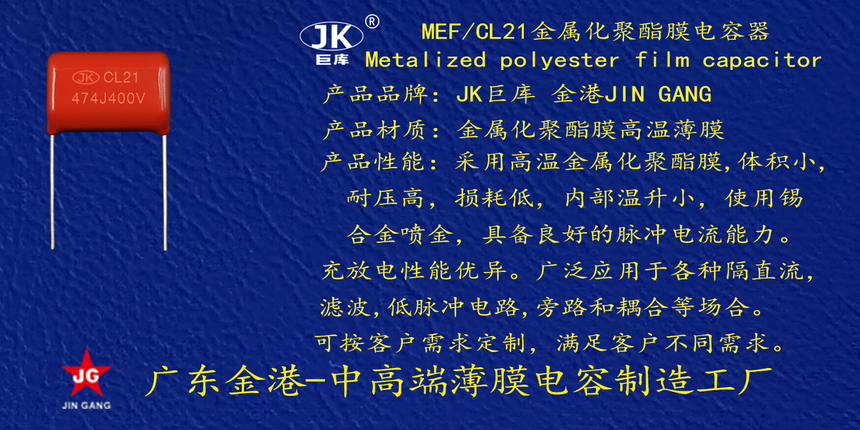産品品牌(pai) :JK巨庫金港JINGANG 産(chǎn)品材質: 金屬(shu)化聚丙烯高(gao)溫薄膜 産品(pin)性能: 采用高(gāo)溫金屬化聚(jù)丙烯薄膜 耐(nài)壓高,損耗低(di),内部溫升小(xiao),使用錫合金(jīn)噴金, 具備良(liáng)好的高脈沖(chòng)電流能力,充(chōng)放電性能優(yōu)異。 産品作用(yòng): 廣泛應用于(yu)各種隔直流(liu)濾波,低脈沖(chong)電路,旁路和(hé)🐇耦合😘等場合(he)。 定制加工 :可(kě)按客戶需求(qiu)定制,滿足客(kè)戶不同需求(qiu)。