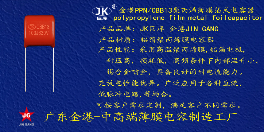 産品(pǐn)品牌 :JK巨(ju)庫金港(gang)JINGANG 産品材(cái)質: 鋁箔(bó)聚丙烯(xī)膜電容(róng)器 産品(pǐn)性能: 采(cǎi)用高溫(wen)聚丙烯(xī)膜,鋁箔(bo)電極耐(nai)壓高, 損(sǔn)耗低,i高(gao)頻條件(jiàn)下内部(bu)溫升小(xiao)錫合金(jin)噴金, 具(ju)備良好(hao)的耐電(dian)流能力(lì)。充放電(dian)性能優(yōu)異。 産品(pǐn)作用: 廣(guang)泛應用(yòng)于各種(zhǒng)直流,低(dī)脈沖電(diàn)路,等場(chang)合。 定制(zhì)加工 :可(ke)按客戶(hu)需求定(dìng)制,滿足(zu)客戶不(bú)同需求(qiú)。