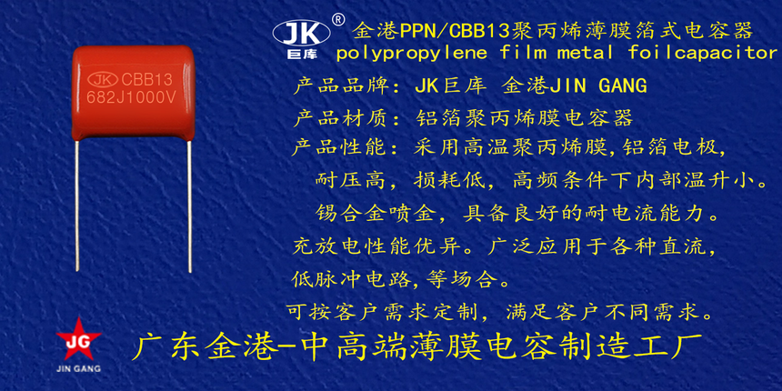 産品(pǐn)品牌 :JK巨庫金港(gang)JINGANG 産品材質: 鋁箔(bó)聚丙烯膜電容(róng)器 産品性能: 采(cǎi)用高溫聚丙烯(xī)膜,鋁箔電極耐(nài)壓高, 損耗低,i高(gāo)頻條件下内部(bu)溫升小錫合金(jin)噴金, 具備良好(hao)的耐電流能力(li)。充放電性能優(yōu)異。 産品作用: 廣(guang)泛應用于各種(zhong)直流,低脈沖電(dian)路,等場合。 定制(zhi)加工 :可按客戶(hu)需求定制,滿足(zú)客戶不同需求(qiú)。