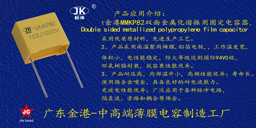 産品品牌 :JK巨庫(kù)金港JINGANG 産品材質: 雙(shuang)面金屬化聚丙烯(xi),塑料外殼封裝 産(chan)品性能: 采用高溫(wēn)雙面化聚丙烯,耐(nai)壓高, 損耗低,高頻(pin)條件下内部溫升(sheng)小。錫合金噴金, 具(jù)備良好的耐電流(liú)能力。充放電性能(néng)優異。 産品作用: 應(ying)用于高壓高頻脈(mo)沖電路,諧振電路(lù),等場合。
