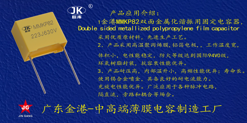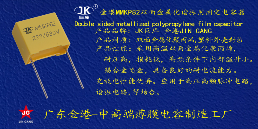 産(chan)品品牌(pai) :JK巨庫金(jīn)港JINGANG 産品(pǐn)材質: 雙(shuang)面金屬(shu)化聚丙(bing)烯,塑料(liao)外殼封(fēng)裝 産品(pǐn)性能: 采(cai)用高溫(wēn)雙面化(hua)聚丙烯(xī),耐壓高(gao), 損耗低(dī),高頻條(tiao)件下内(nei)部溫升(shēng)小。錫合(he)金噴金(jin), 具備良(liáng)好的耐(nài)電流能(neng)力。充放(fang)電性能(néng)優異。 産(chan)品作用(yòng): 應用于(yu)高壓高(gāo)頻脈沖(chong)電路,諧(xie)振電路(lu),等場合(he)。