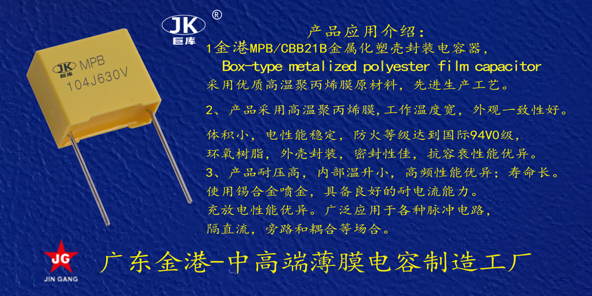 産品品(pǐn)牌 :JK巨庫金港JINGANG 産品(pin)材質: 高溫金屬化(huà)聚丙烯,塑料外殼(ké)封裝 産品性能: 采(cai)用高溫金屬化聚(jù)丙烯,耐壓高産品(pǐn)一緻性好, 損耗低(di),内部溫升小。錫合(hé)金噴金, 具備良好(hao)的耐電流能力。充(chong)放電性能優異。 産(chǎn)品作用: 應用于高(gāo)壓高頻脈沖電路(lù),諧振電路,等場合(he)。