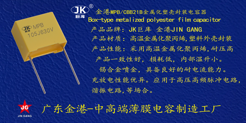 産品品牌(pái) :JK巨庫金港JINGANG 産品(pin)材質: 高溫金屬(shu)化聚丙烯,塑料(liao)外殼封裝 産品(pǐn)性能: 采用高溫(wen)金屬化聚丙烯(xi),耐壓高産品一(yī)緻性好, 損耗低(dī),内部溫升小。錫(xī)合金噴金, 具備(bei)良好的耐電流(liú)能力。充放電性(xing)能優異。 産品作(zuò)用: 應用于高壓(ya)高頻脈沖電路(lù),諧振電路,等場(chǎng)合。
