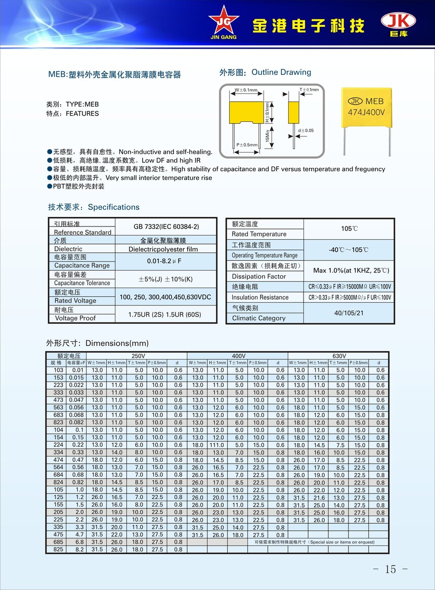 産(chǎn)品品牌(pái) :JK巨庫金(jin)港JINGANG 産品(pǐn)材質: 高(gao)溫金屬(shu)化聚脂(zhī)薄膜,塑(su)料外殼(ke)封裝 産(chan)品性能(neng): 采用高(gao)溫金屬(shu)化聚脂(zhi)薄膜,耐(nai)壓高