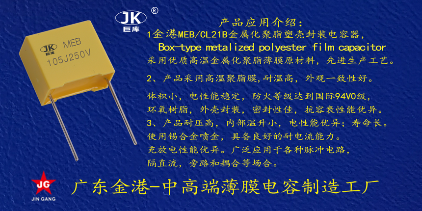 産品品(pin)牌 :JK巨庫金港(gang)JINGANG 産品材質: 高(gao)溫金屬化聚(ju)脂薄膜,塑料(liao)外殼封裝 産(chǎn)品性能: 采用(yong)高溫金屬化(huà)聚脂薄膜,耐(nài)壓高