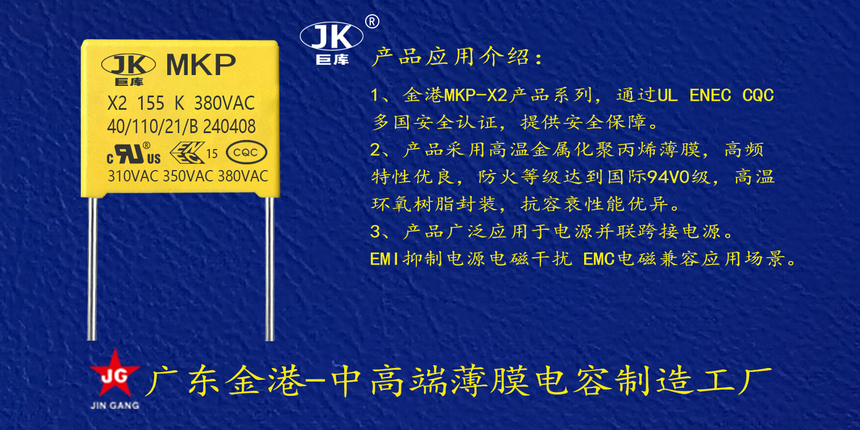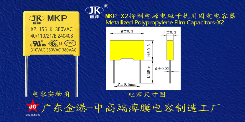 産品(pin)品牌 :JK巨庫金港JINGANG 産(chan)品材質: 金屬化聚(ju)丙烯高溫薄膜 産(chǎn)品性能: 采用高溫(wēn)金屬化聚丙烯薄(bao)膜 耐壓高,損耗低(di),内部溫升小,使用(yong)錫合金噴金, 具備(bèi)良好的通電流能(neng)力。 産品作用: 廣泛(fan)應用于各種交流(liu)跨接,抗幹擾電路(lu)場景。 定制加工 :可(kě)按客戶需求定制(zhi),滿足客戶不同需(xū)求。
