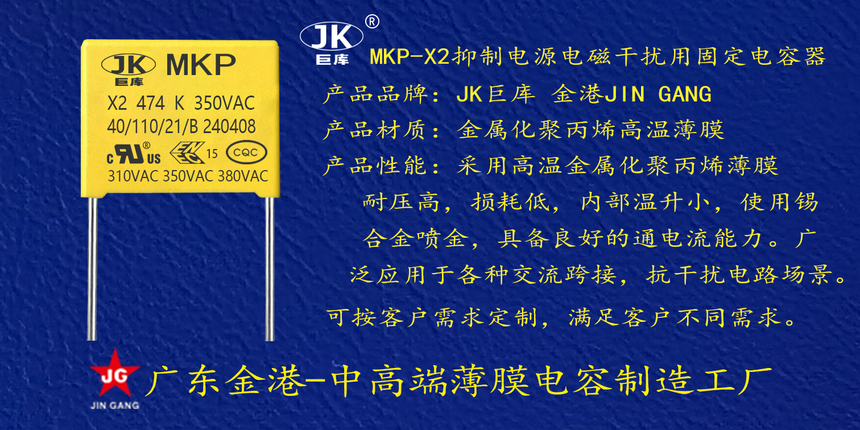 産品品牌(pái) :JK巨庫金港JINGANG 産(chan)品材質: 金屬(shǔ)化聚丙烯高(gāo)溫薄膜 産品(pǐn)性能: 采用高(gāo)溫金屬化聚(jù)丙烯薄膜 耐(nai)壓高,損耗低(dī),内部溫升小(xiao),使用錫合金(jīn)噴金, 具備良(liang)好的通電流(liú)能力。 産品作(zuo)用: 廣泛應用(yòng)于各種交流(liú)跨接,抗幹擾(rao)電路場景。 定(ding)制加工 :可按(àn)客戶需求定(dìng)制,滿足客戶(hu)不同需求。